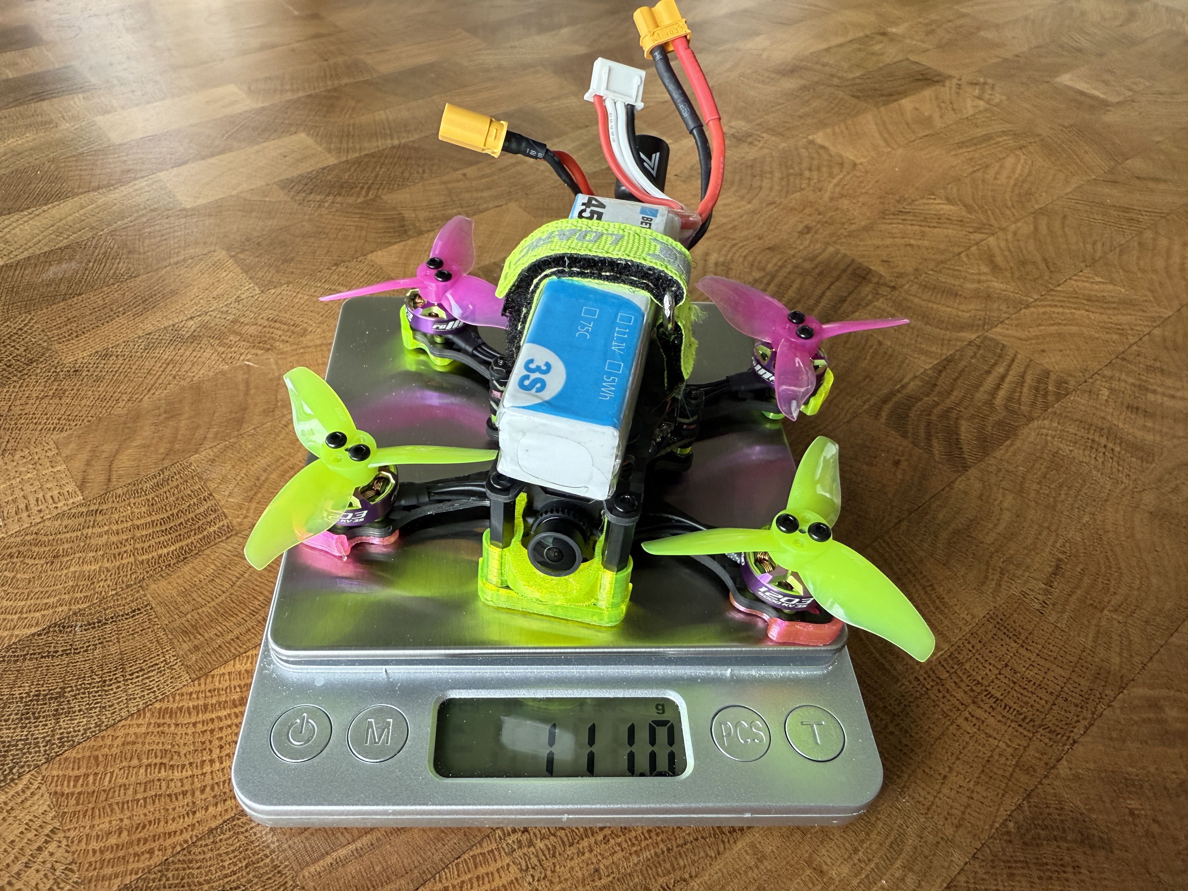 I usually get about 2 - 3 minutes flight time with 3s 450mah but I use 650mah aswell. You can feel the weight though.
