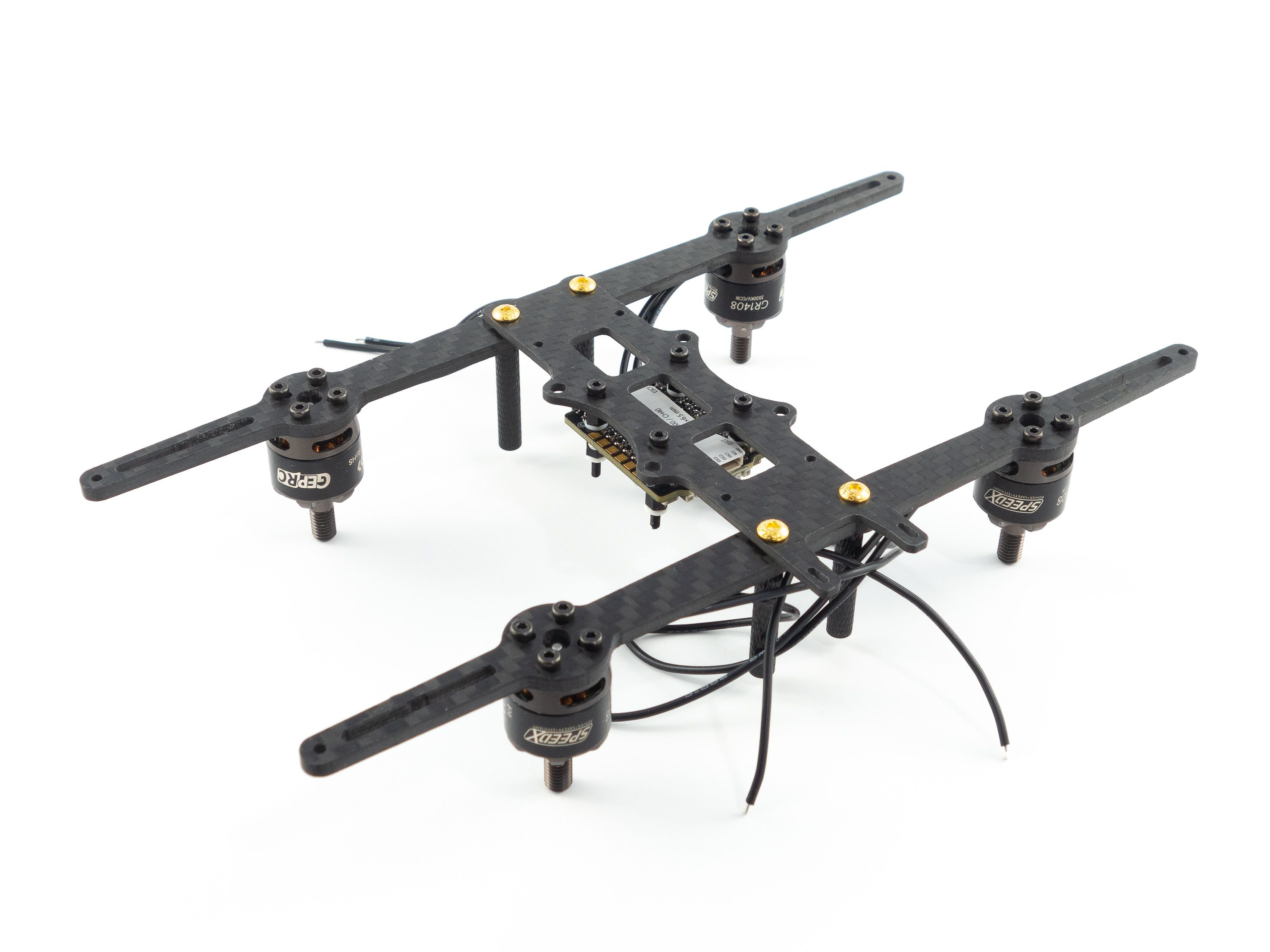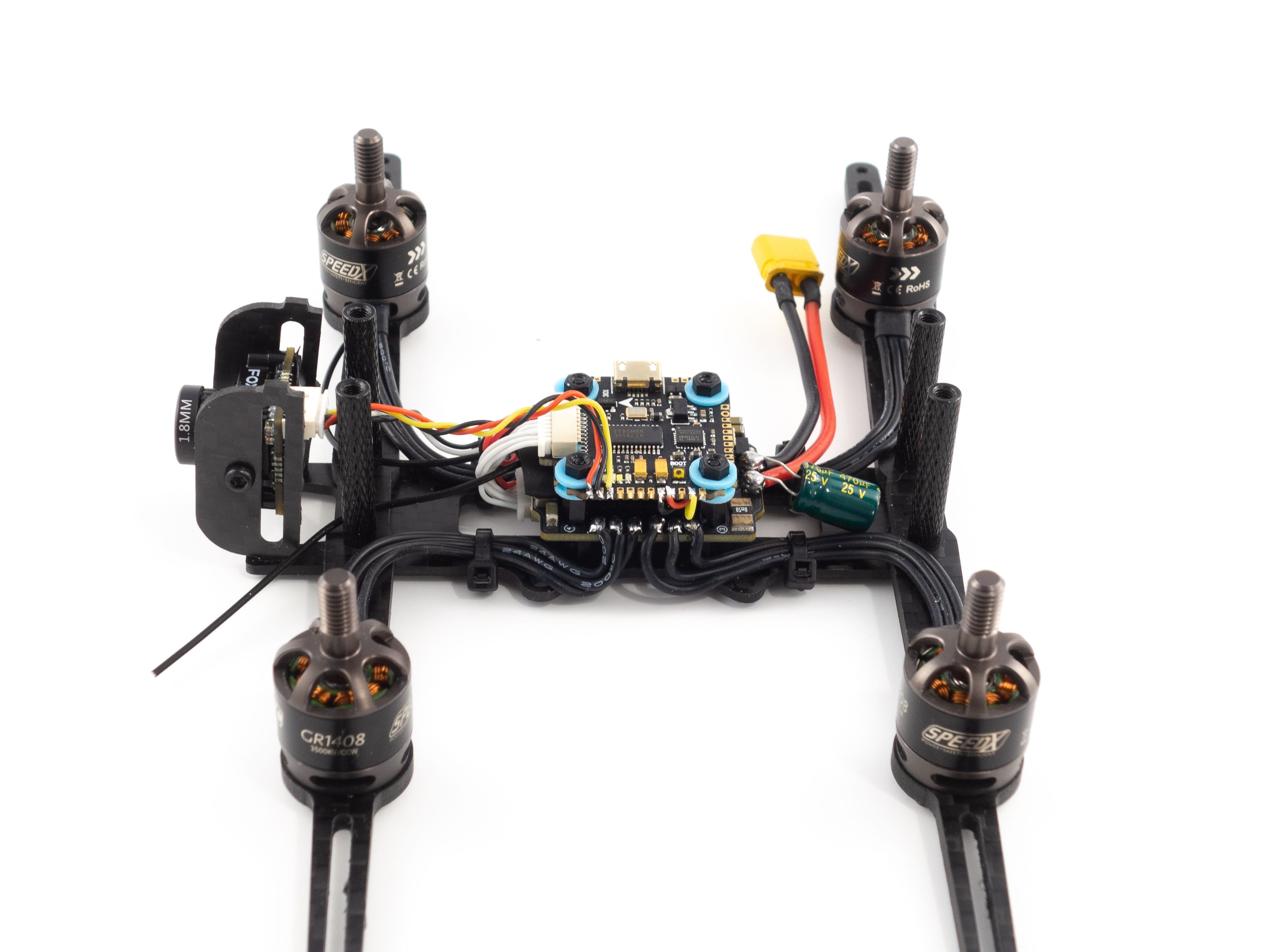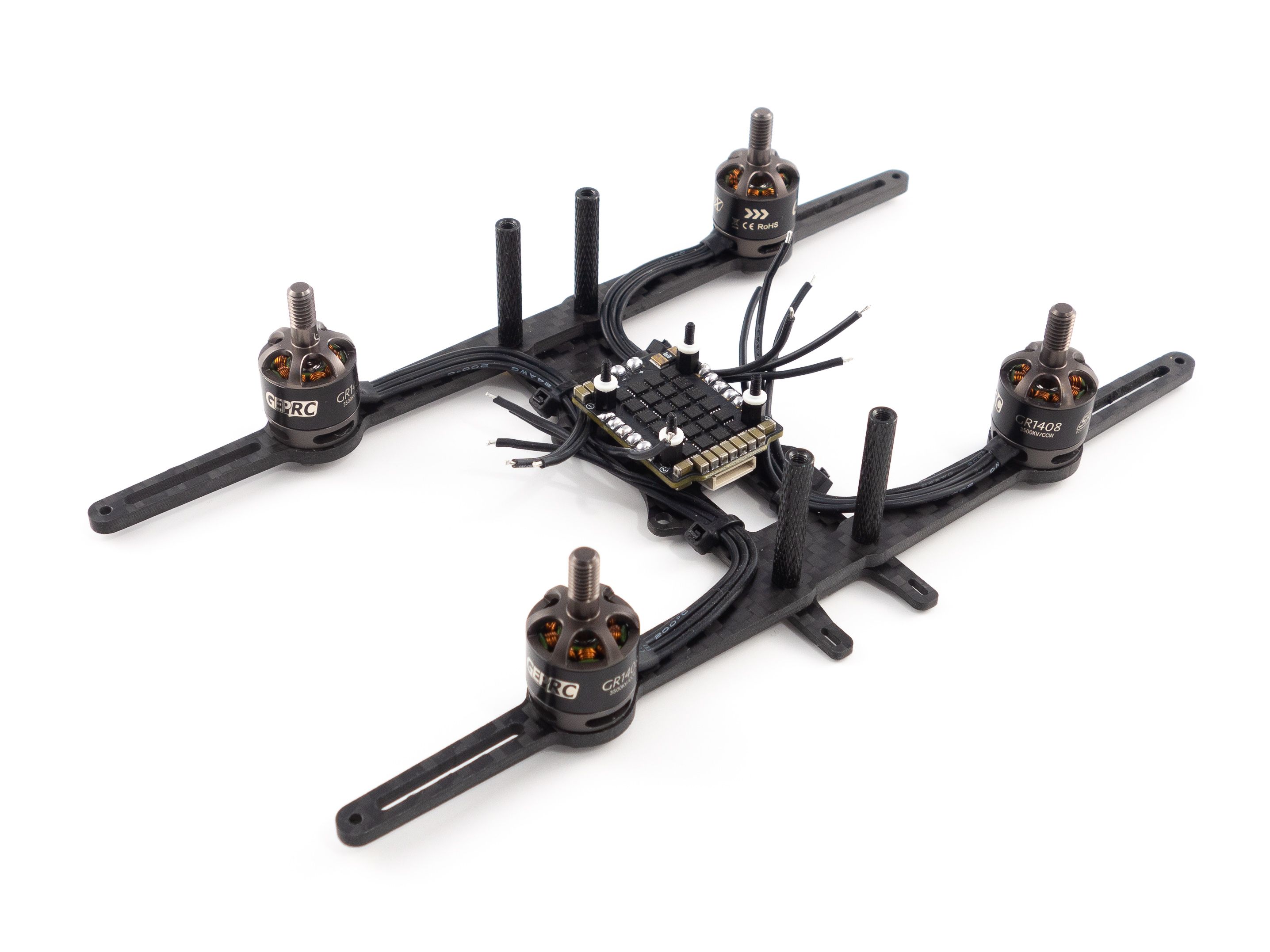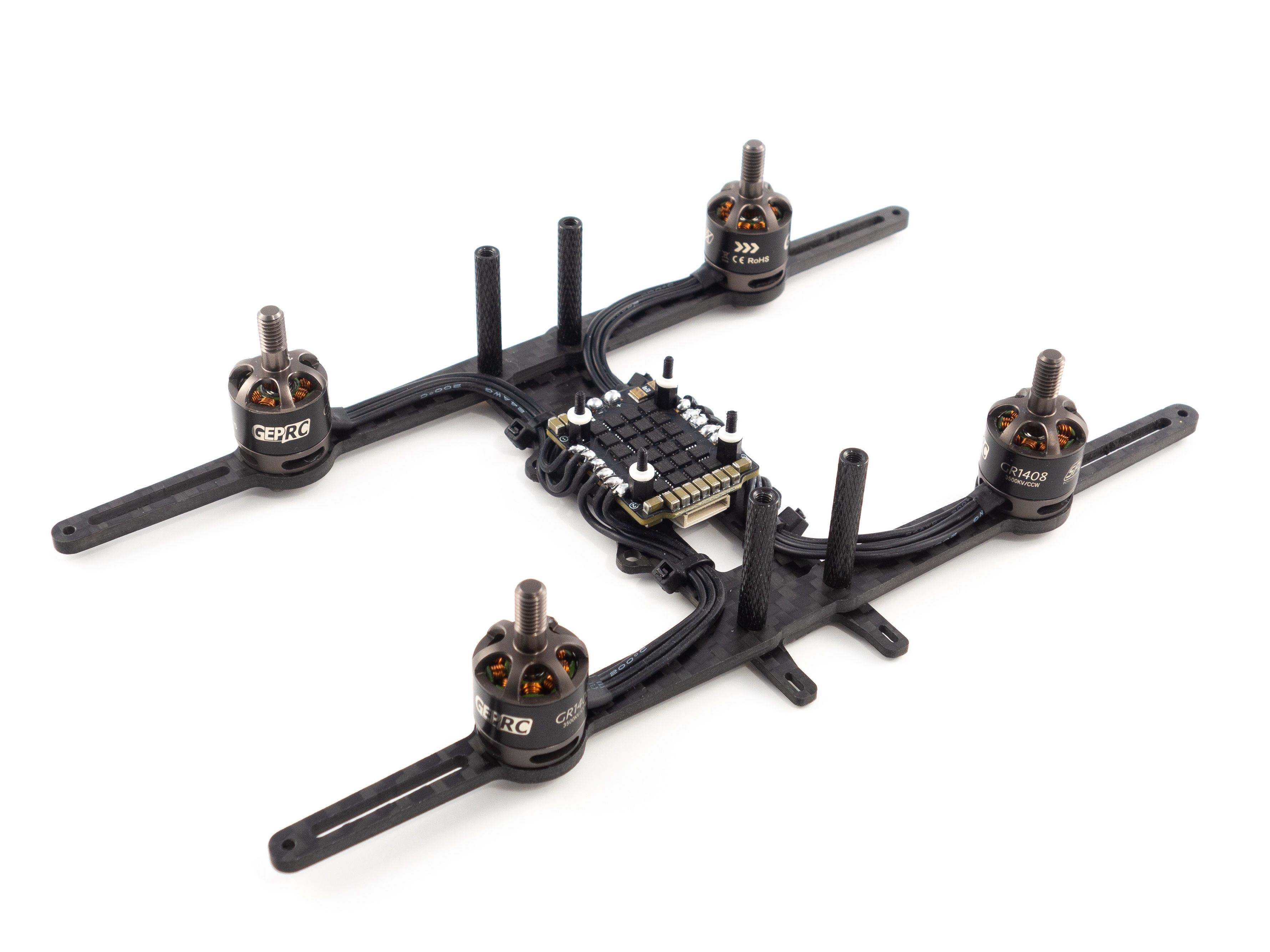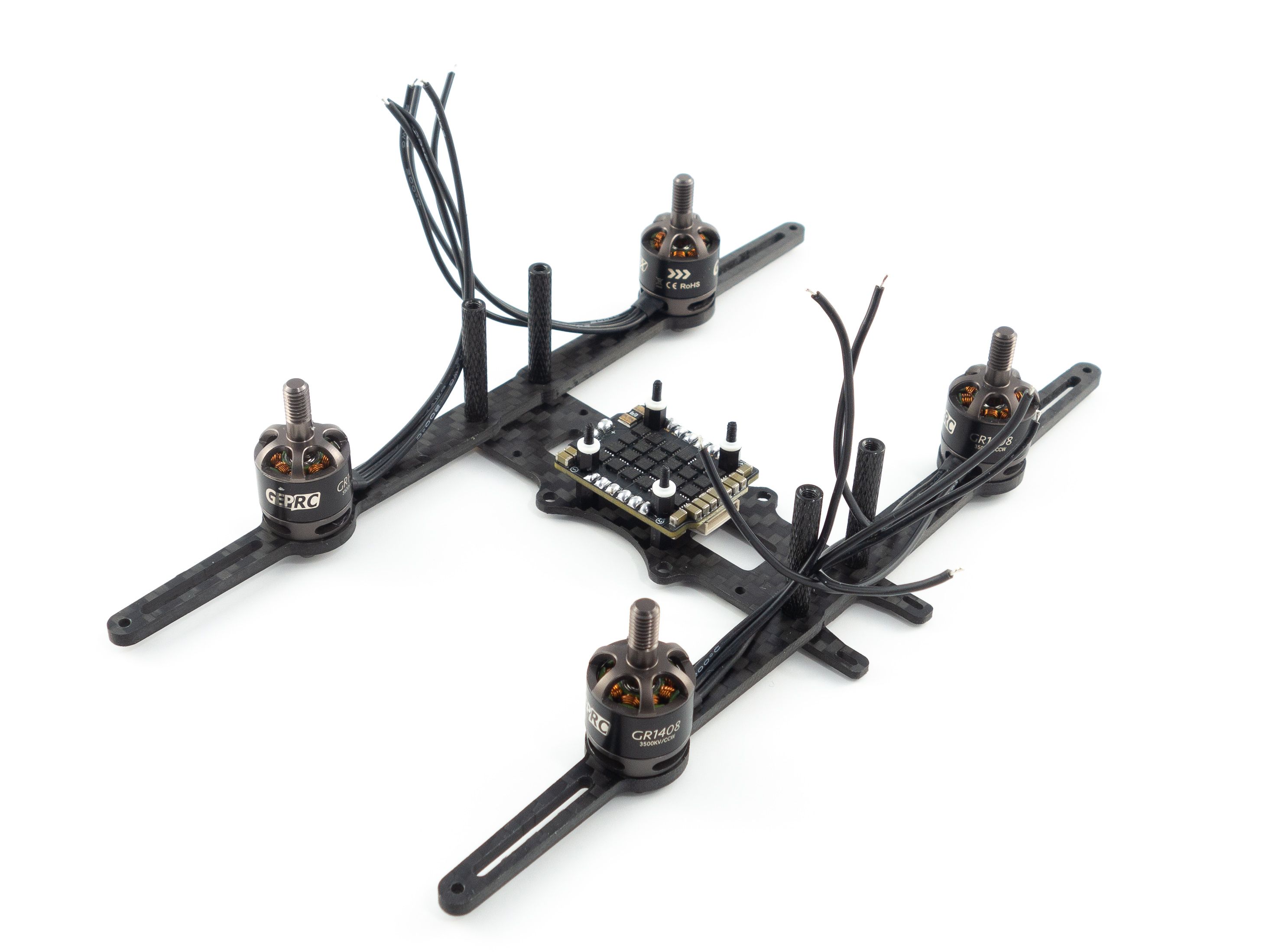 Frame AssemblyThis frame is really easy to assemble. You don't need the ducts or any of the TPU parts just yet, so save those for the end. To start you only need the base plate and the arms. Use the included gold screws to mount the arms on top of the base plate. Screw the black standoffs above to hold everything in place.