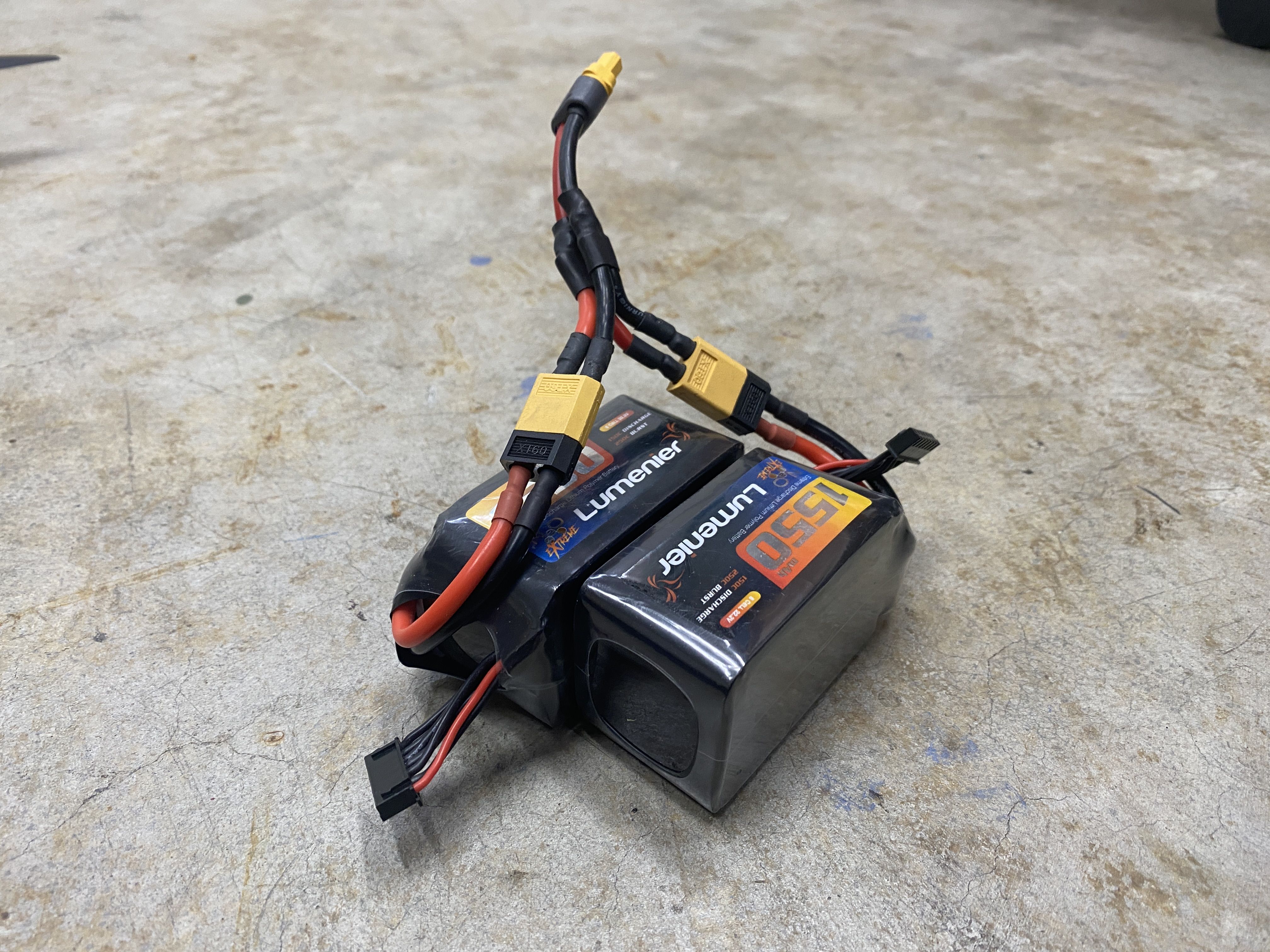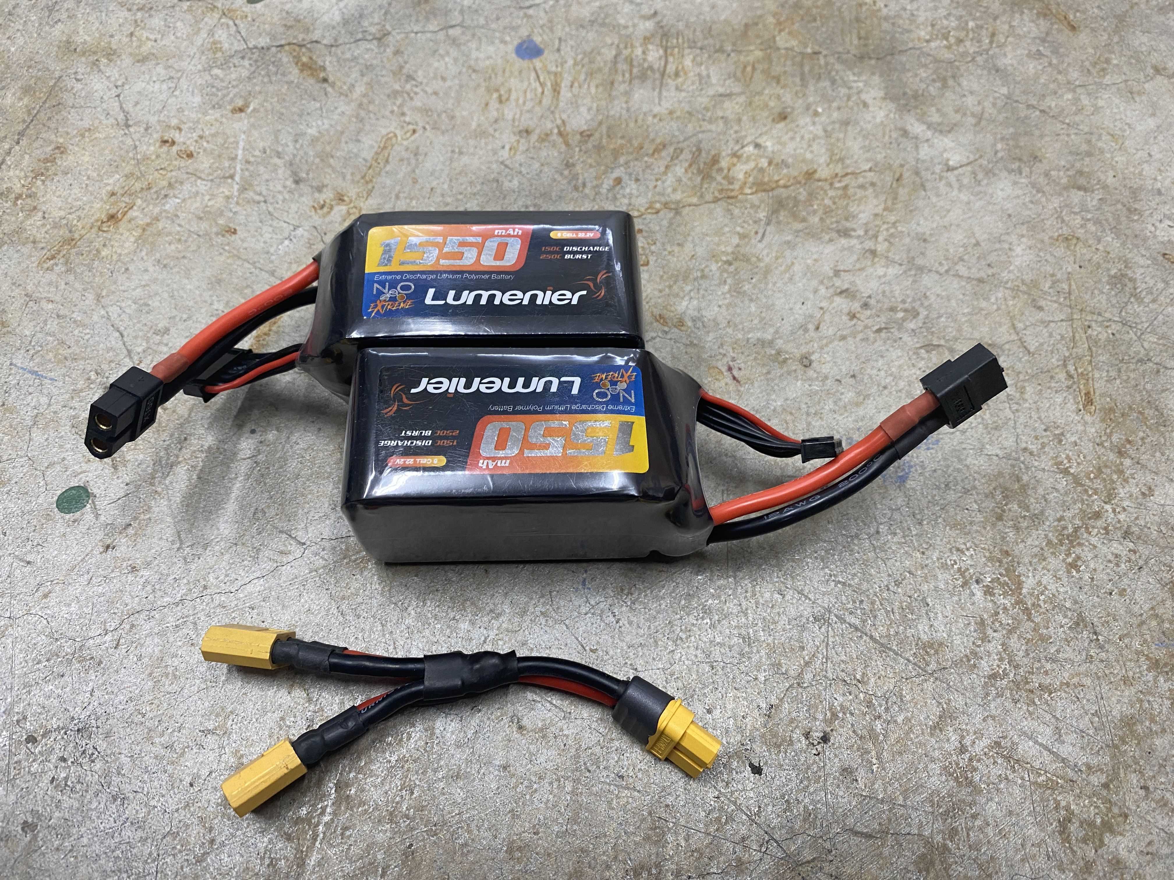 Lipo Battery - Initially I was planning to use the CNHL 2200mah and 1800mah 6s lipos that I was using on with the AOS 7†quad, but I think they are going bad because the voltage is sagging a lot when I tried to do anything other than cruising around. I did not want to buy new Lipo batteries so I took two Lumenier 1550mAh 6s lipos and double side tape them together. Beore doubling up the 1550mah Lumenier packs, I tried flying it as a single pack and did not fly very well because it was too light.