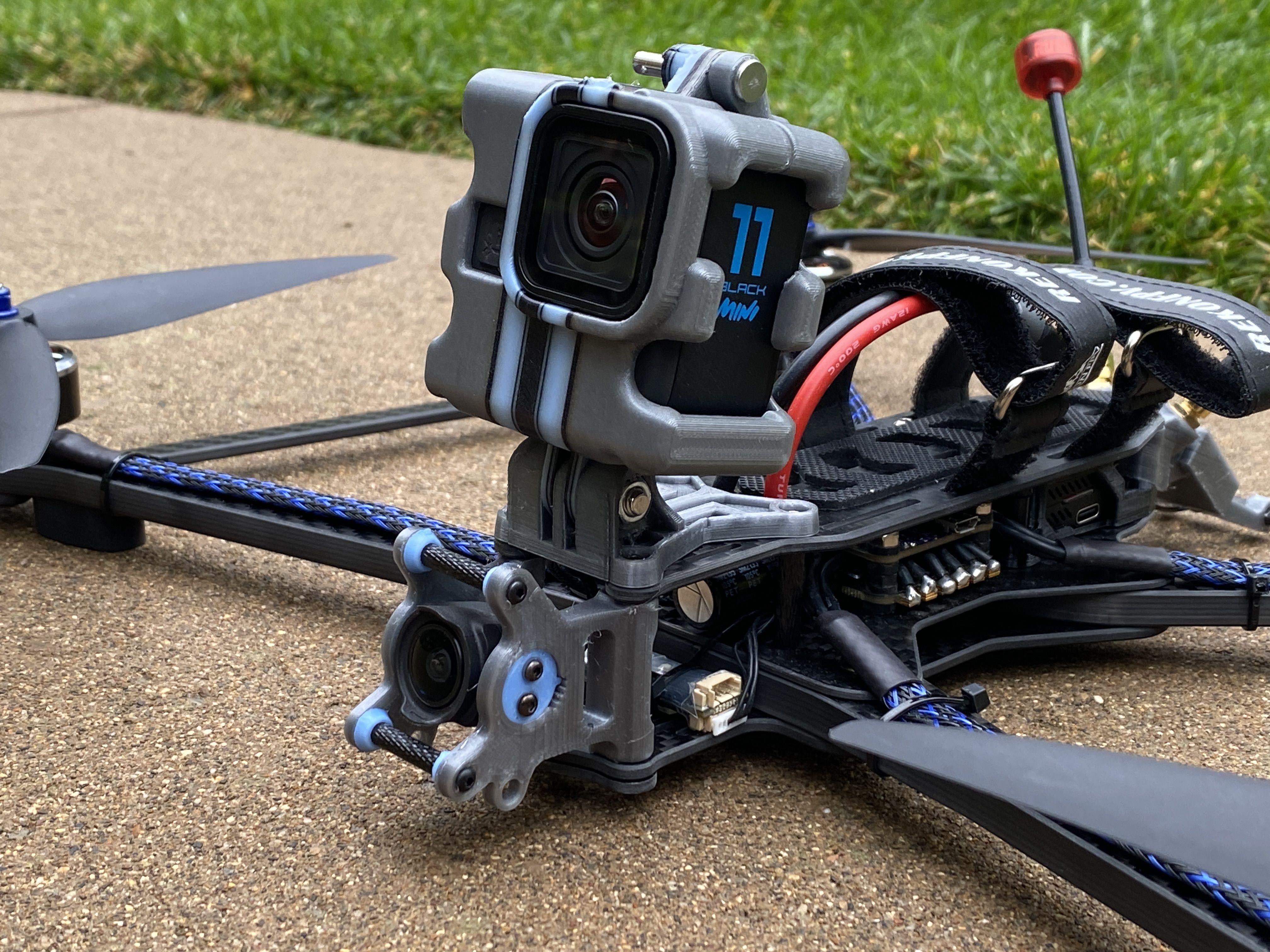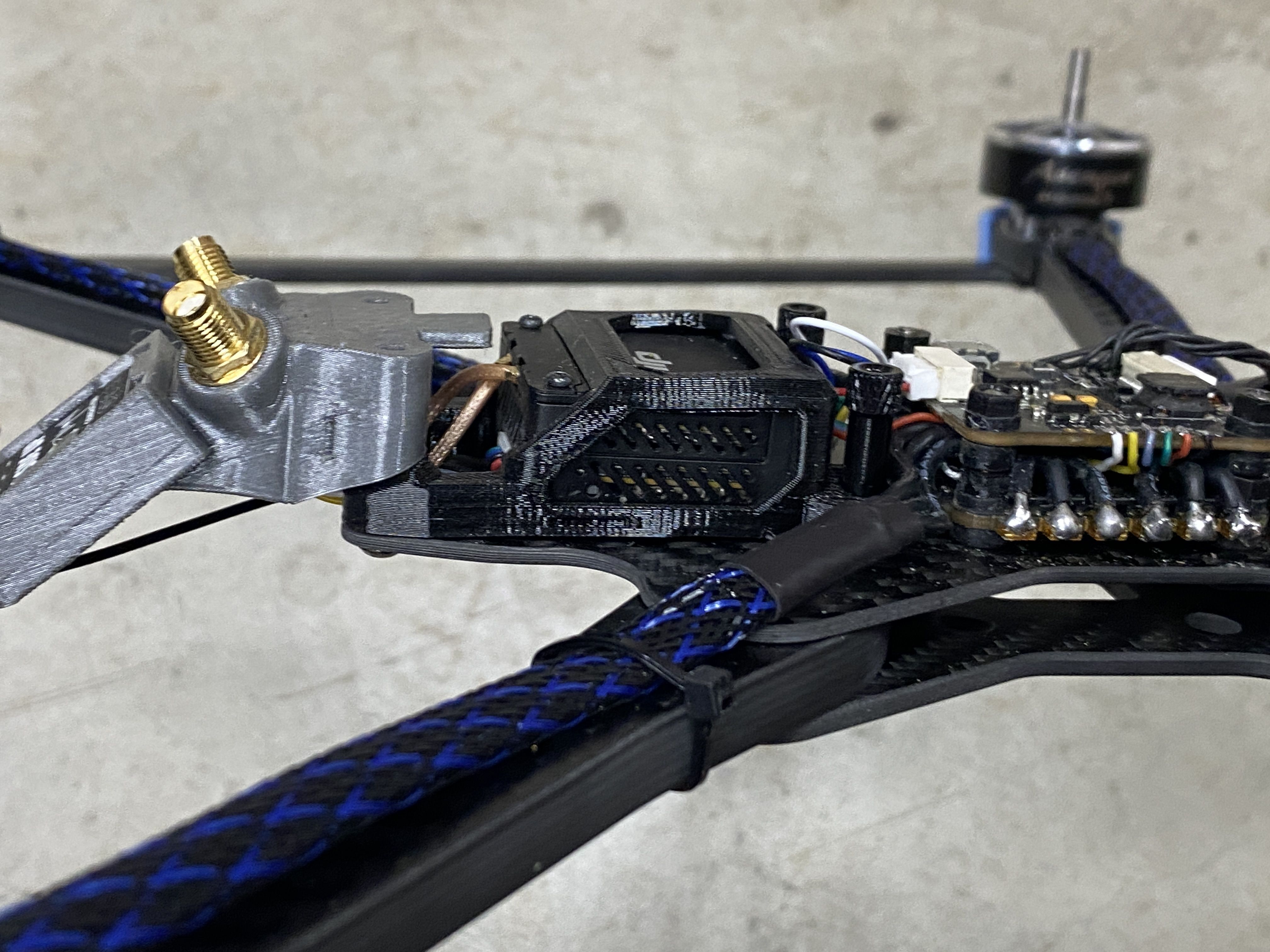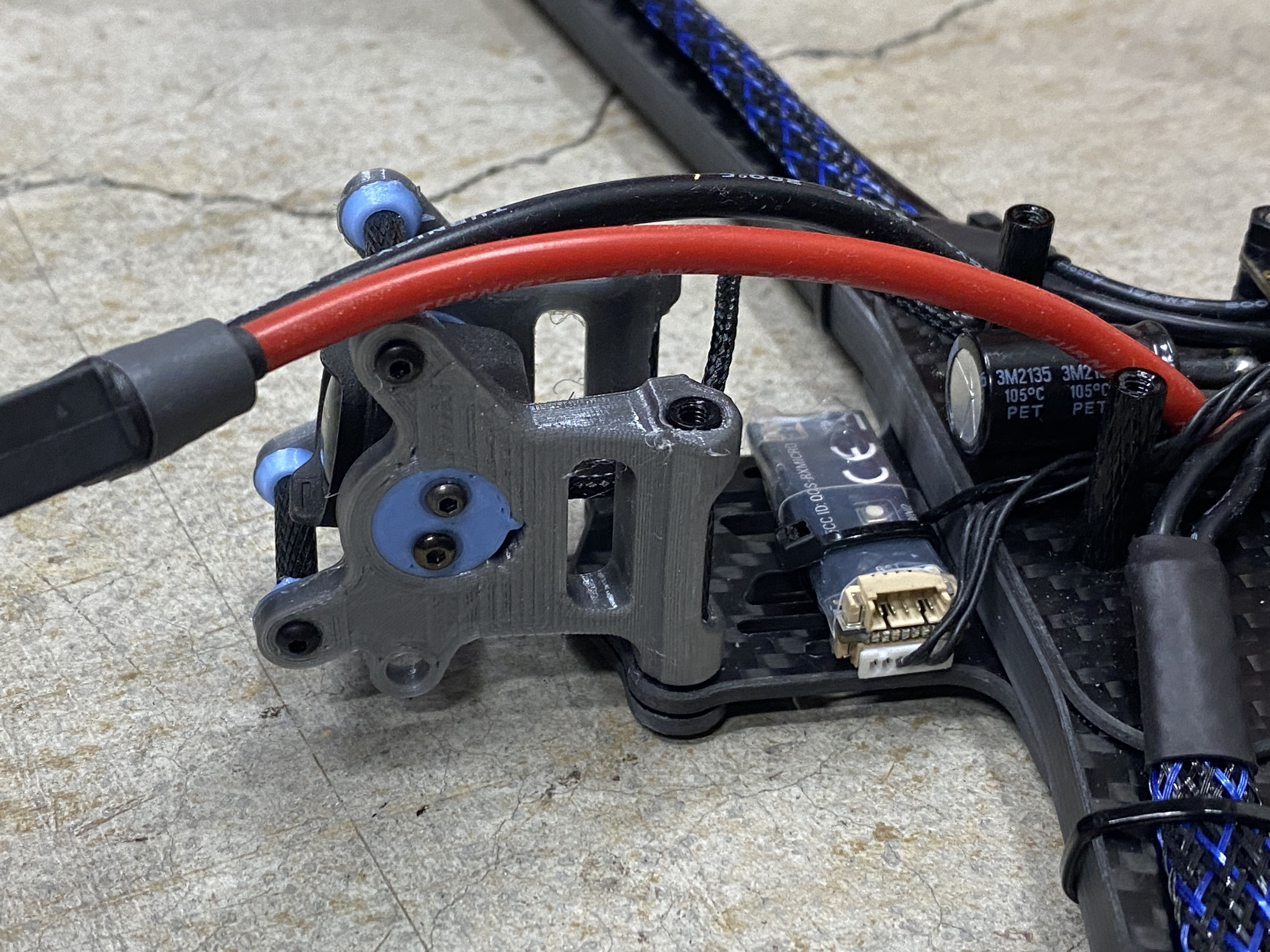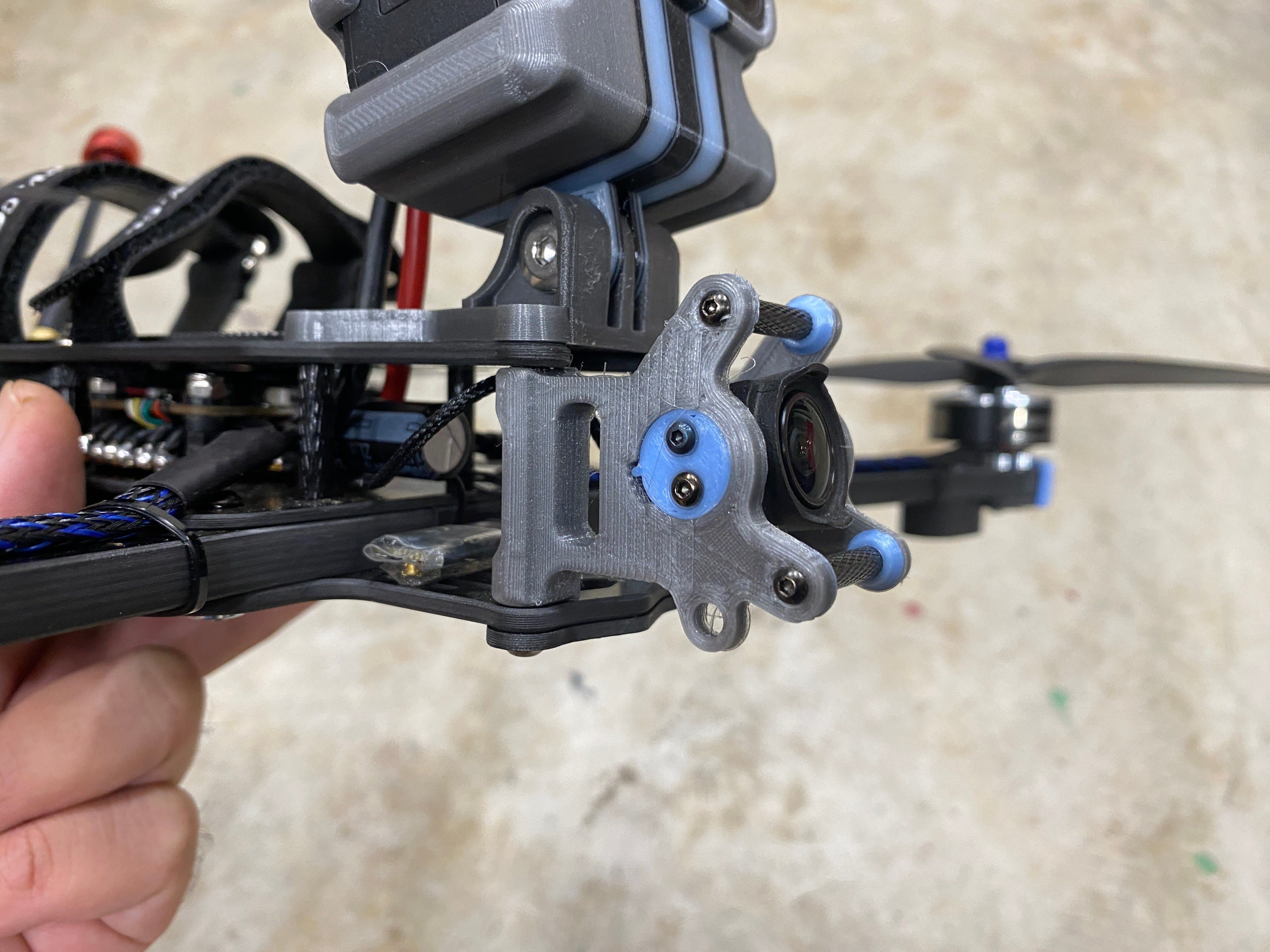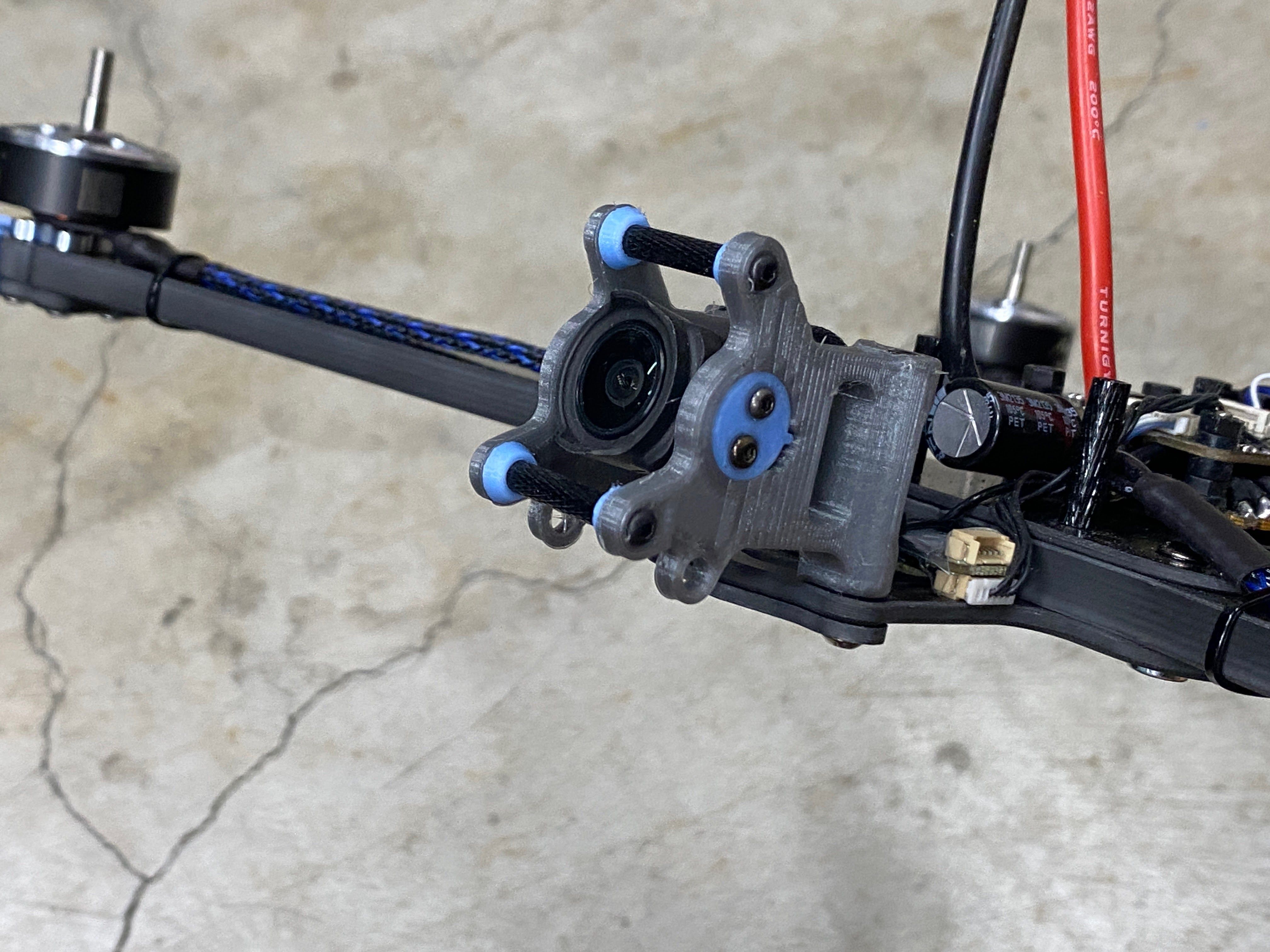 3D Prints - The first thing I do with all my builds is to figure out all the 3D printed parts. Since the Rekon 10 is NOT a common frame, there were not much options for existing STL files on sites like Thinkiverse. The framekit came with a few different 3D printed accessories but unfortunately most of it did not suit my needs. The only thing what was useful was the DJI O3 mount and everything else I needed to create. Even though this frame is a deadcat layout, I can tell the prop will still be in the FPV cameras view, so I modified the same camera mount that was used in many of my previous O3 builds. This version is a prototype with a friction fit adjustable angle FPV camera mount. The camera also sits between a soft silicon vibration dampeners to reduce any vibrations or jello that the O3 systems is known to have.
