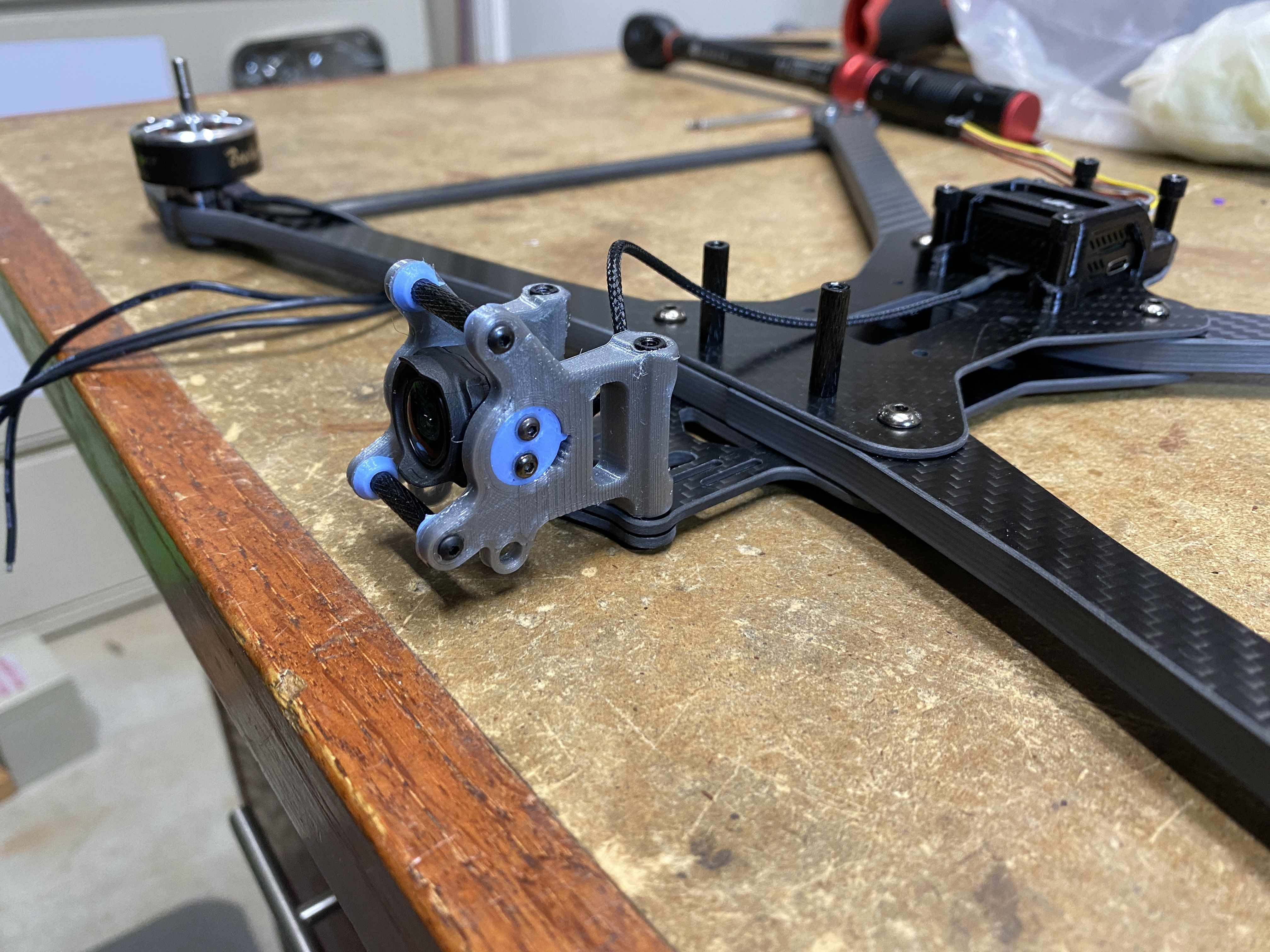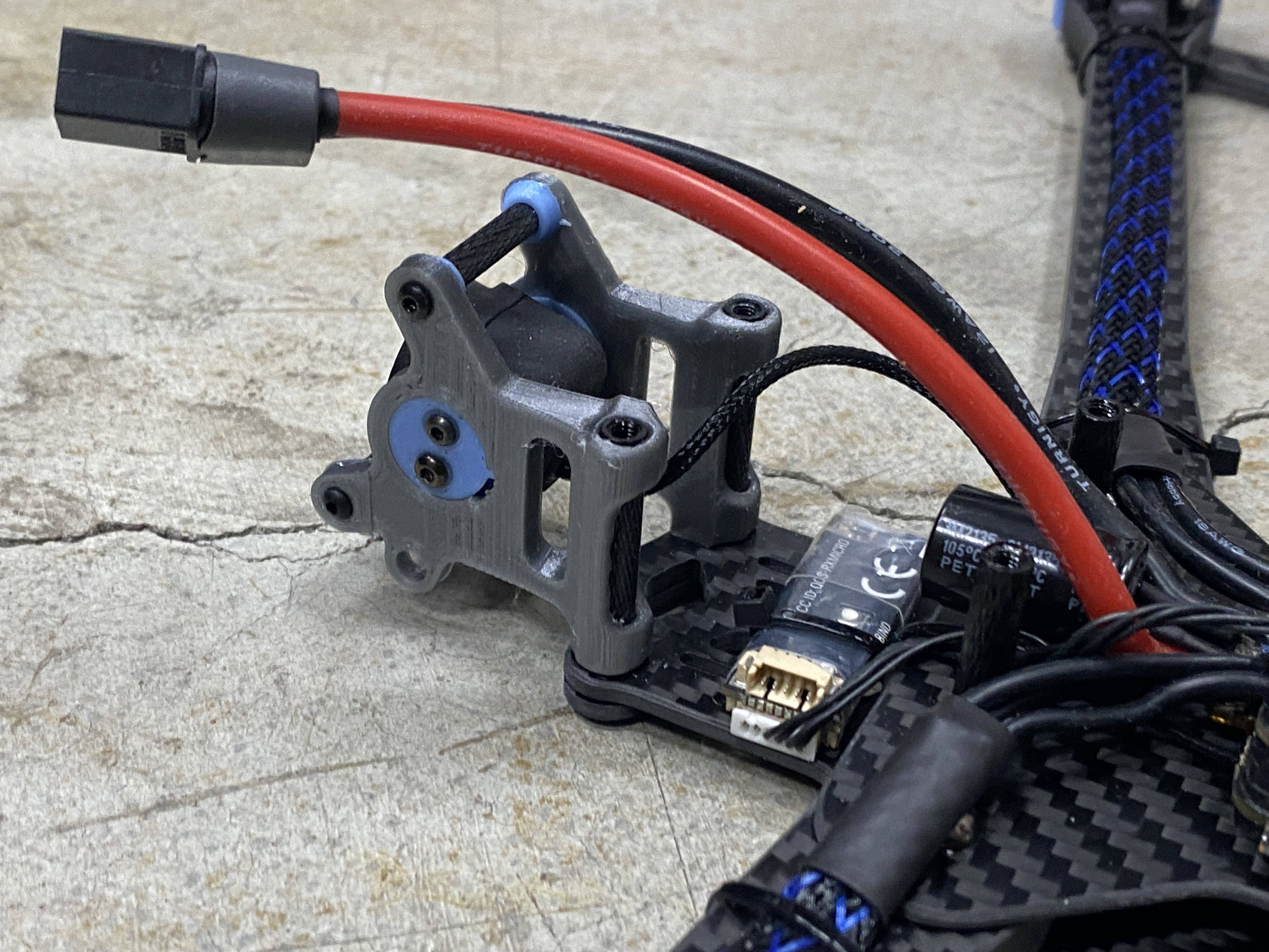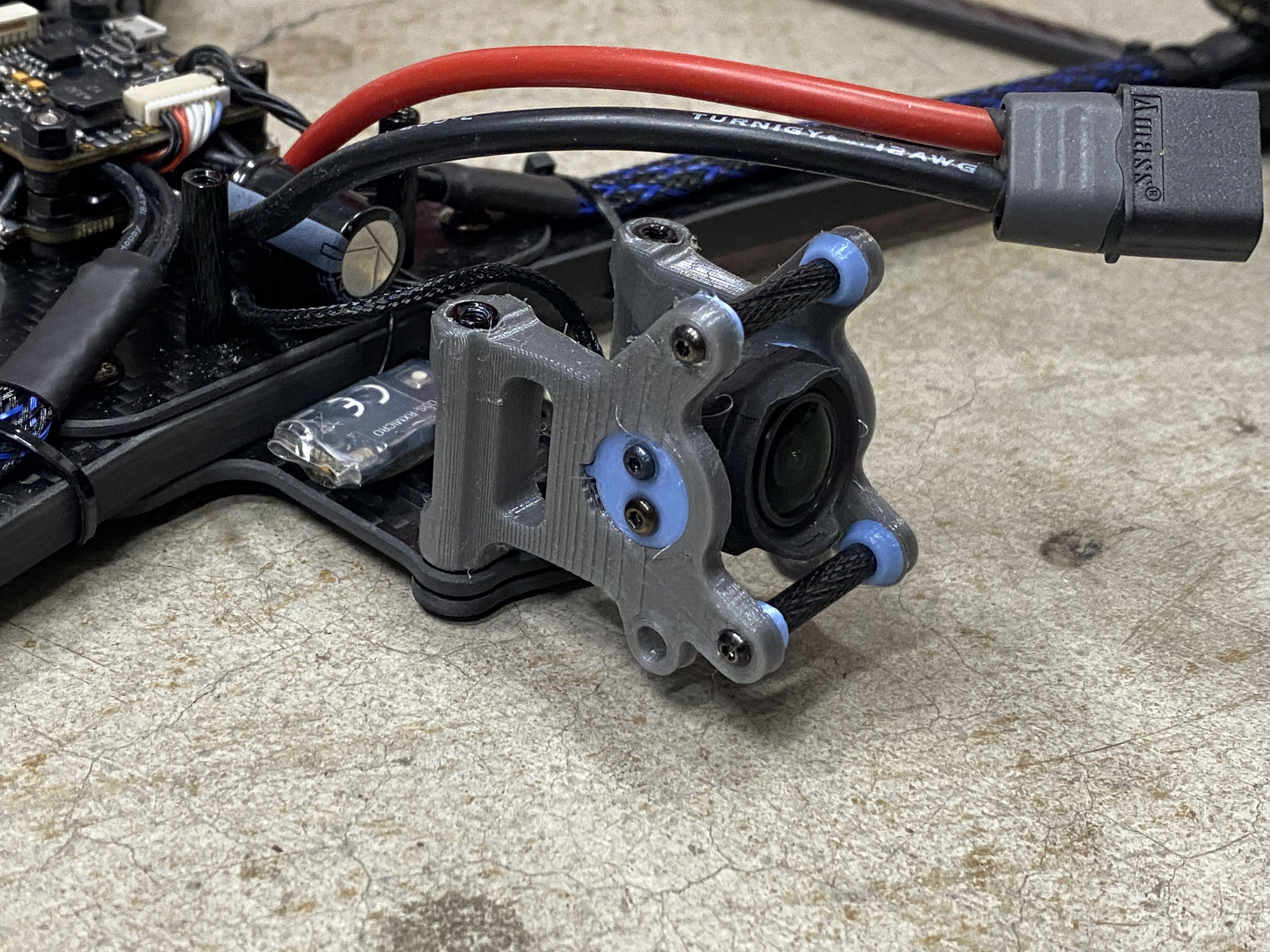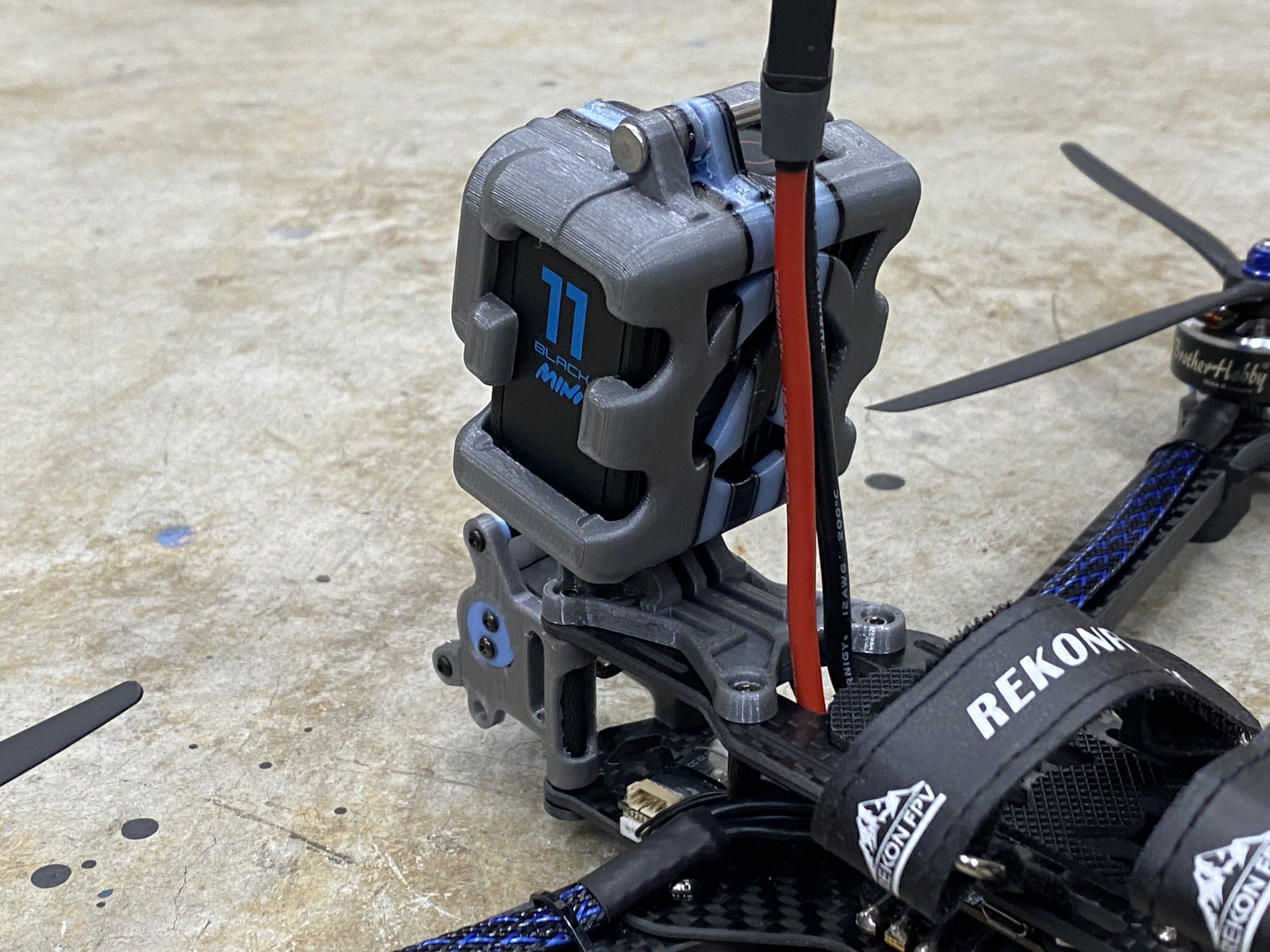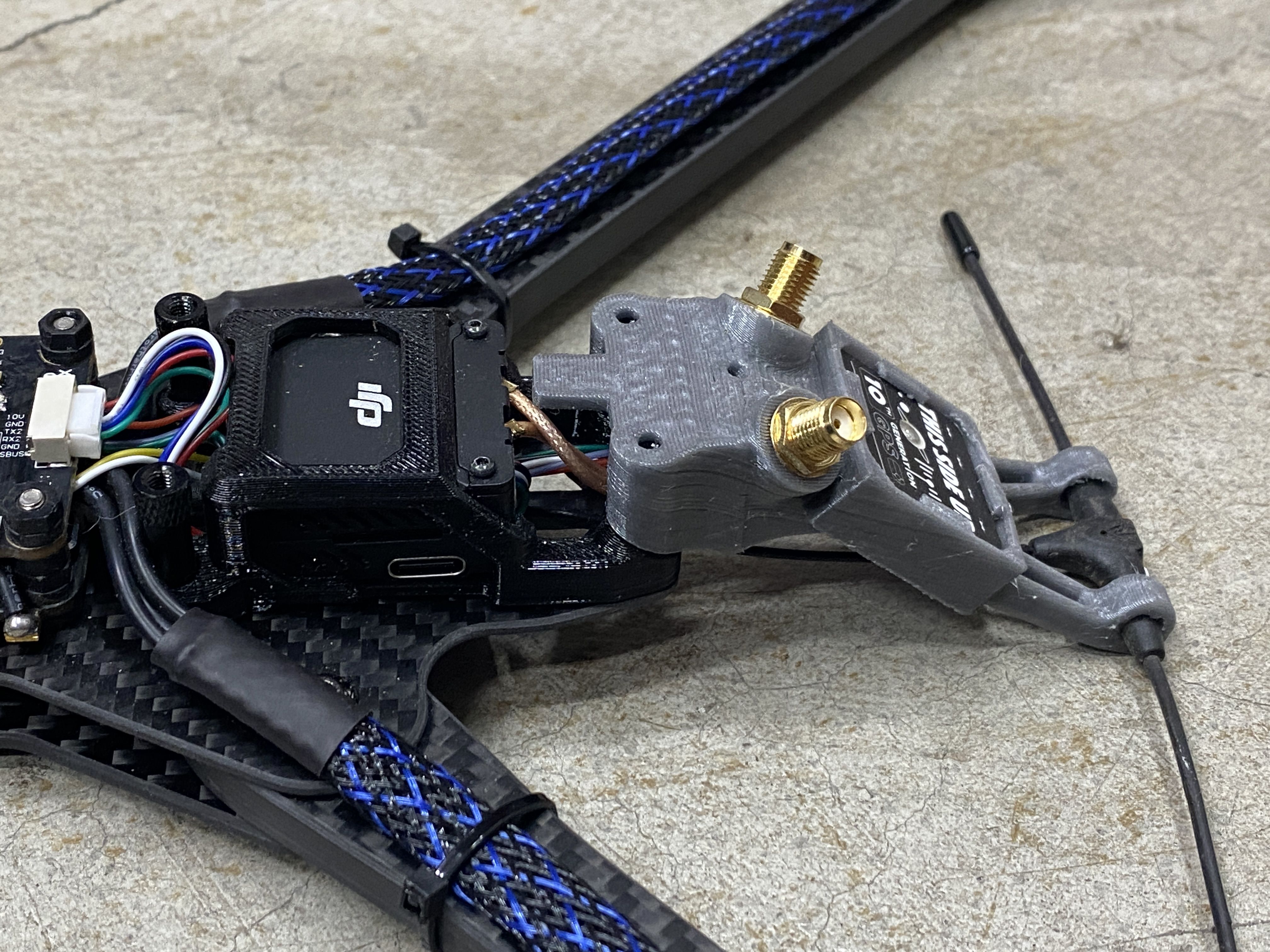 3D Prints - The first thing I do with all my builds is to figure out all the 3D printed parts. Since the Rekon 10 is NOT a common frame, there were not much options for existing STL files on sites like Thinkiverse. The framekit came with a few different 3D printed accessories but unfortunately most of it did not suit my needs. The only thing what was useful was the DJI O3 mount and everything else I needed to create. Even though this frame is a deadcat layout, I can tell the prop will still be in the FPV cameras view, so I modified the same camera mount that was used in many of my previous O3 builds. This version is a prototype with a friction fit adjustable angle FPV camera mount. The camera also sits between a soft silicon vibration dampeners to reduce any vibrations or jello that the O3 systems is known to have.