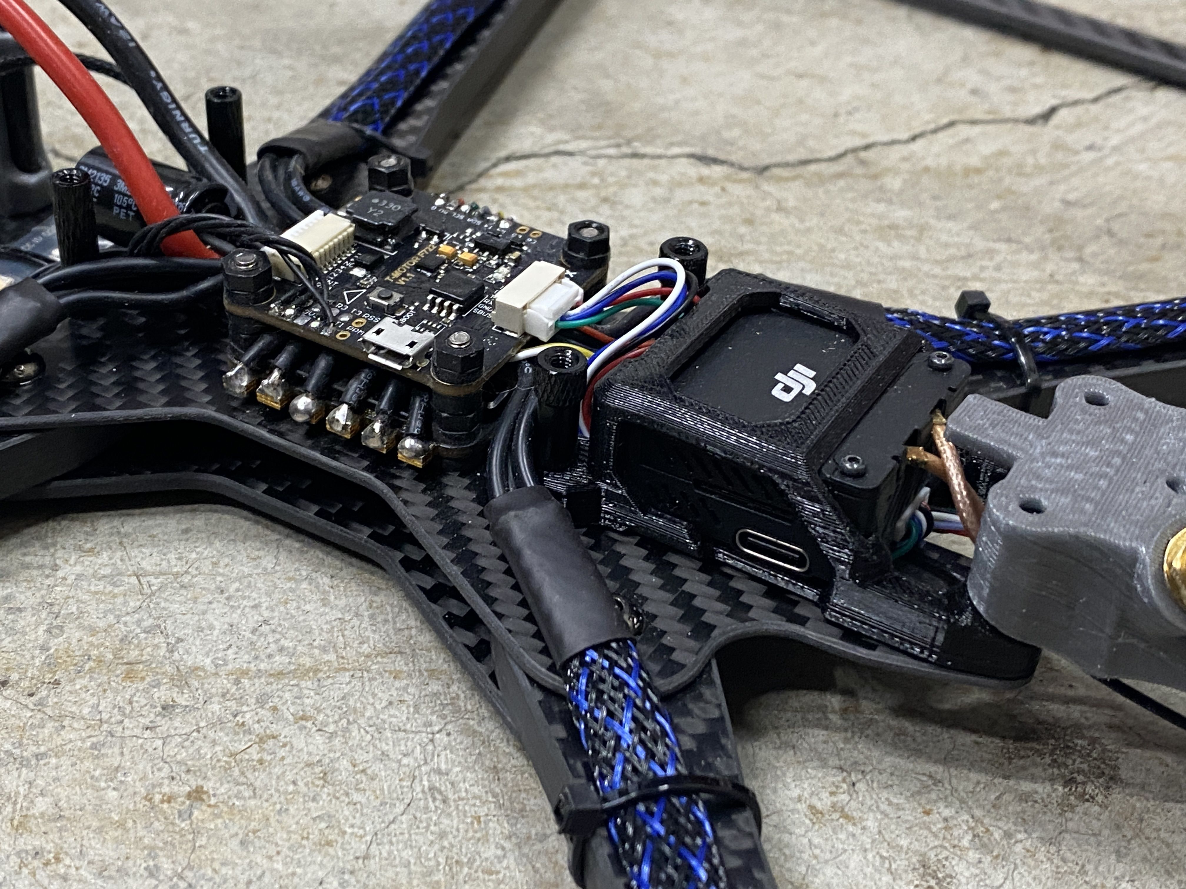 Wiring – For the motor wires I wrapped them inside 1/4 inch PET Expandable Braided Sleeving that I bought from Amazon. To keep the wiring nice and tidy, I ran the motor wires under the flight controller and soldered the wires from the inside. This is mainly for aesthetic reasons because it is a pain to replace a motor. Also take notice of the O3 air unit in mounted to the rear of quad. The camera cable needs to be replace with a longer 200mm cable because the original is too short.