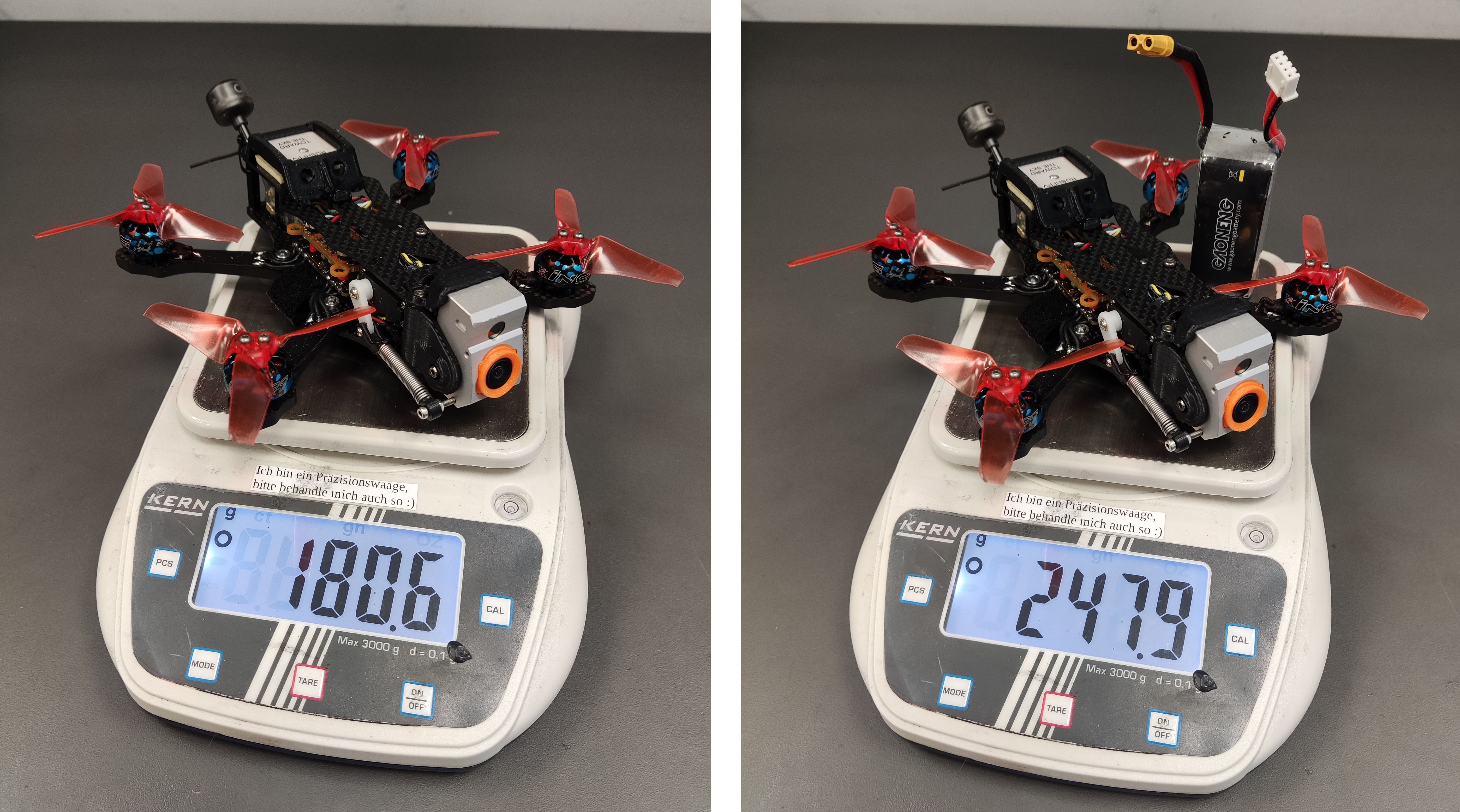 Finally we reached a weight of 180.6g without battery. With a 3S battery it’s still beneath 250g. Sufficient for a flight time of up to 8 minutes.