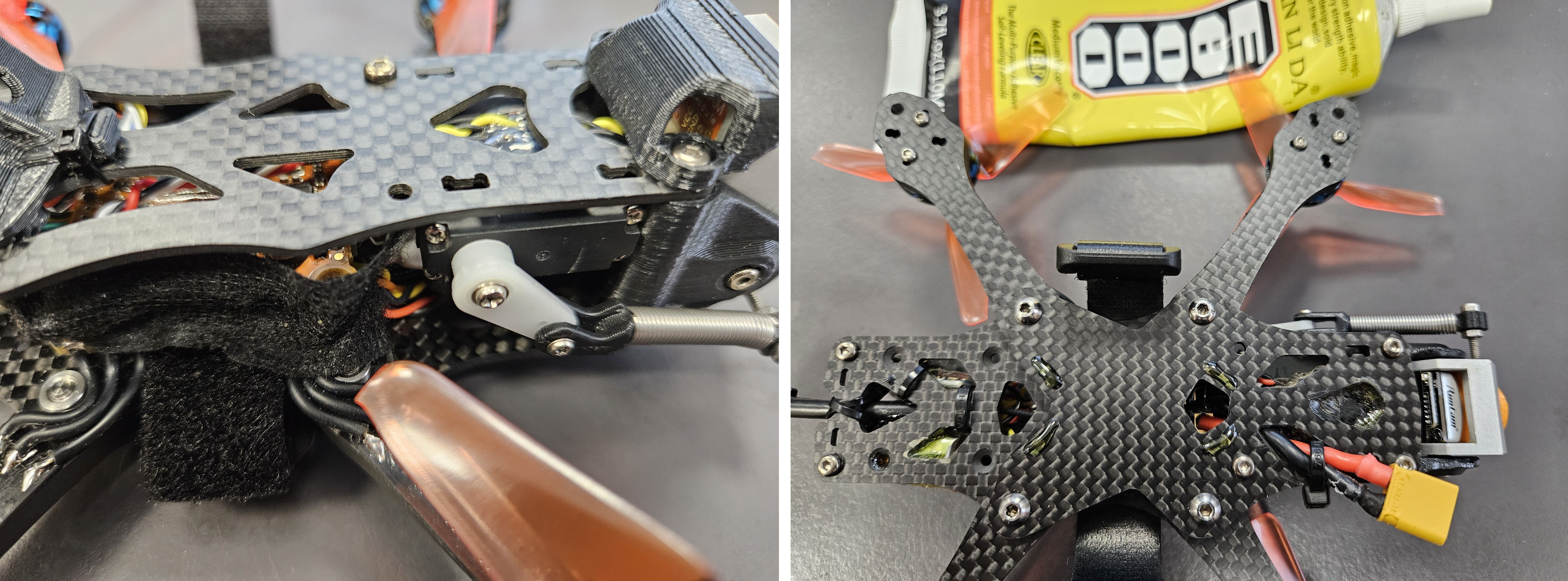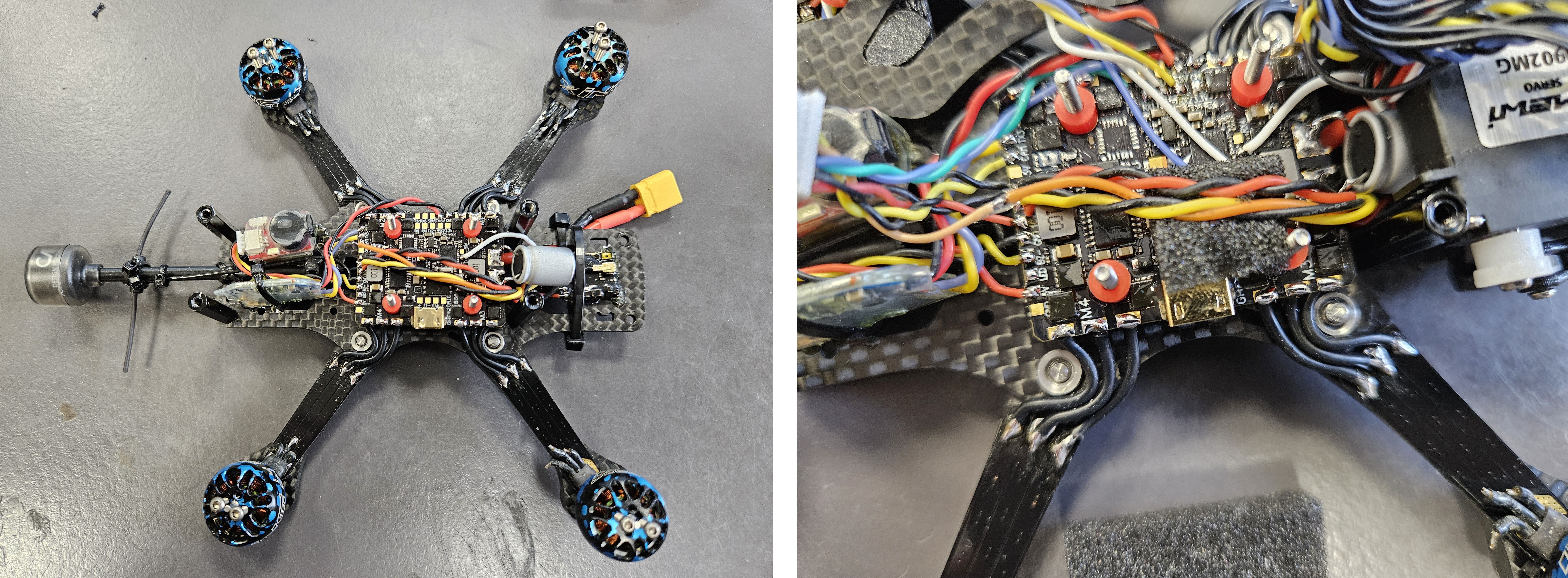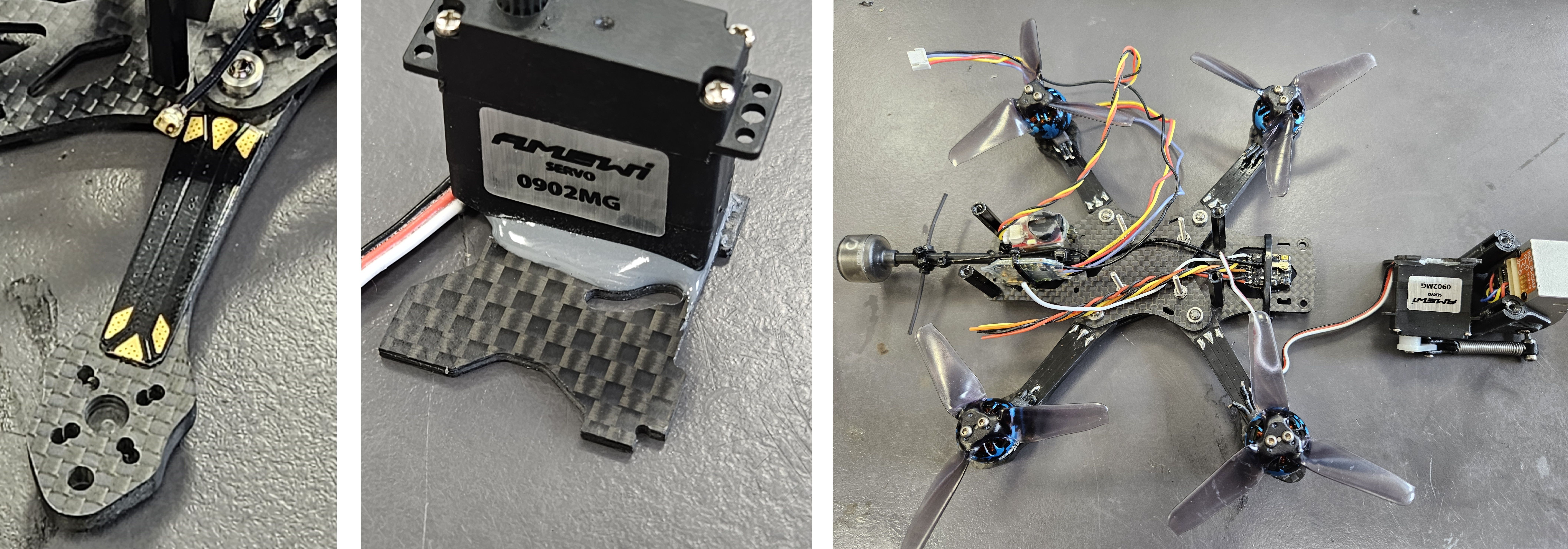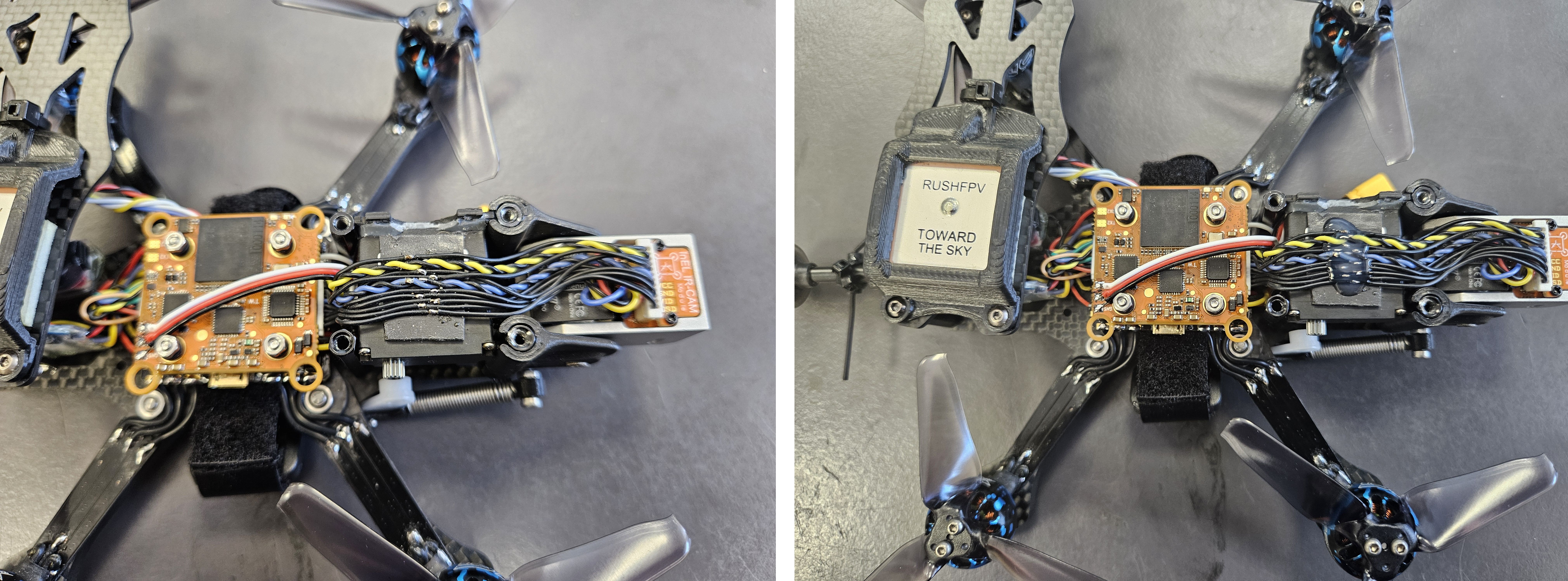 Use racewires to protect the motor cables from the propellers. This also makes it easier to replace the motors. You can file them so it fits for this frame. To save weight titan screws are used. The servo is glued to the side plate. Use glue like E8000, this one will not get completely hard. The brushless motors on the pictures are not the final ones. Instead RCINPOWER SmooX 1404 Plus 3850KV are used. A VTX, buzzer and ELRS receiver are installed. The VTX is installed at the front so that the GPS is less disturbed.