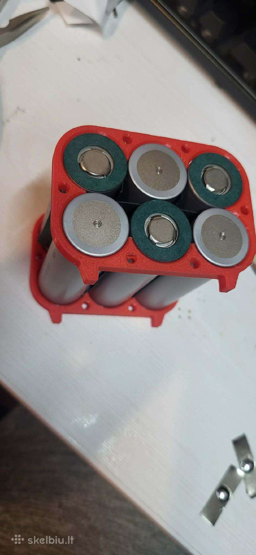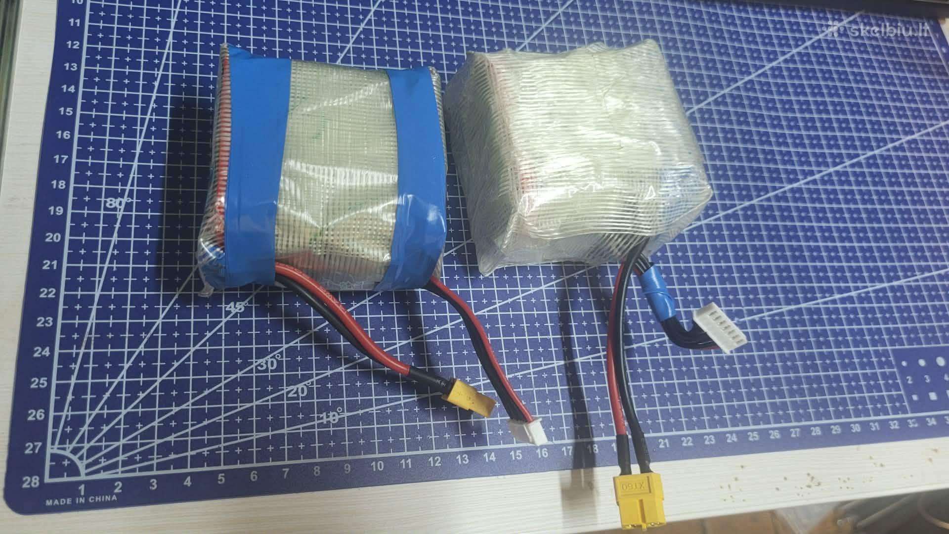 Savo rankomis pagaminta 6S1P baterija (2 vnt.) Iš RS50 baterijos, talpa – 5000 mAh (50A, pikas 70A), jungtis – XT60. Naudota tik porą skrydžių pratestavimui. 7" (~1 kg svorio) tri-blade drono statistika iš paskutinio skrydžio: Skrydžio trukmė – 32 min. OSD rodė ~3750 mAh sunaudojimą Nusileista su ~3.05 V likučiu Skrydžio metu 3–4 kartus daryti „punchai“ (su ~51–53 A pikais)