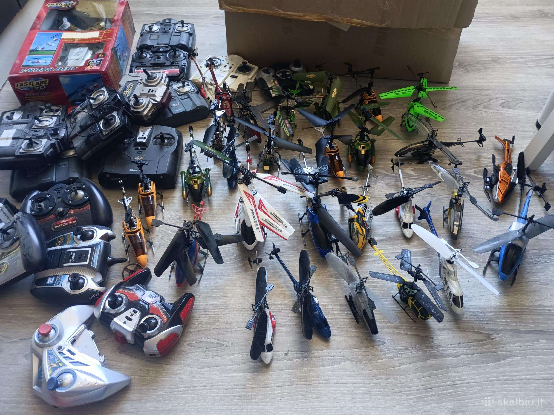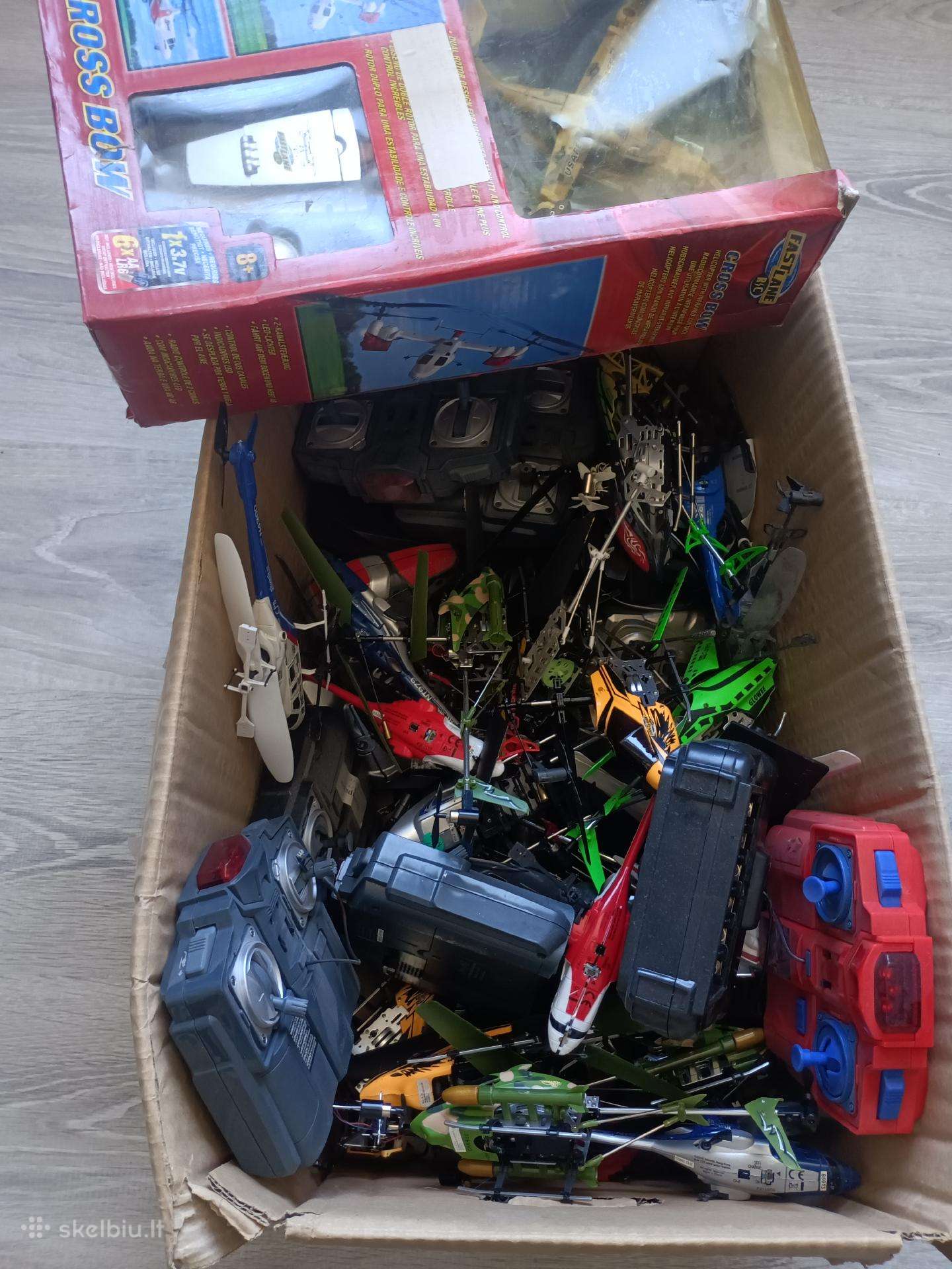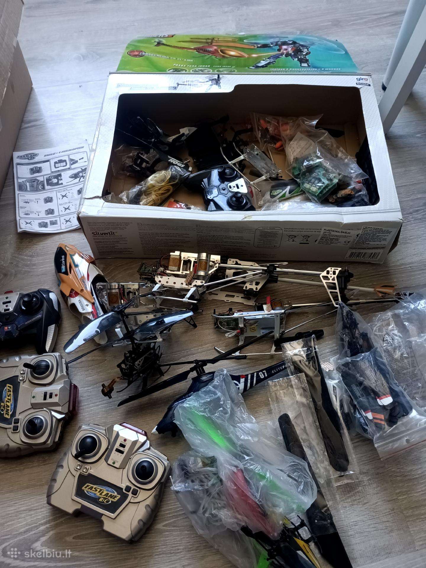 Dvi dėžės veikiančių ir ne RC sraigtasparniu su valdymo pultais ir atsarginem dalimi, kurimui ar dar kam, 35+ vnt. parduodami viskas kartu, galimas siuntimas